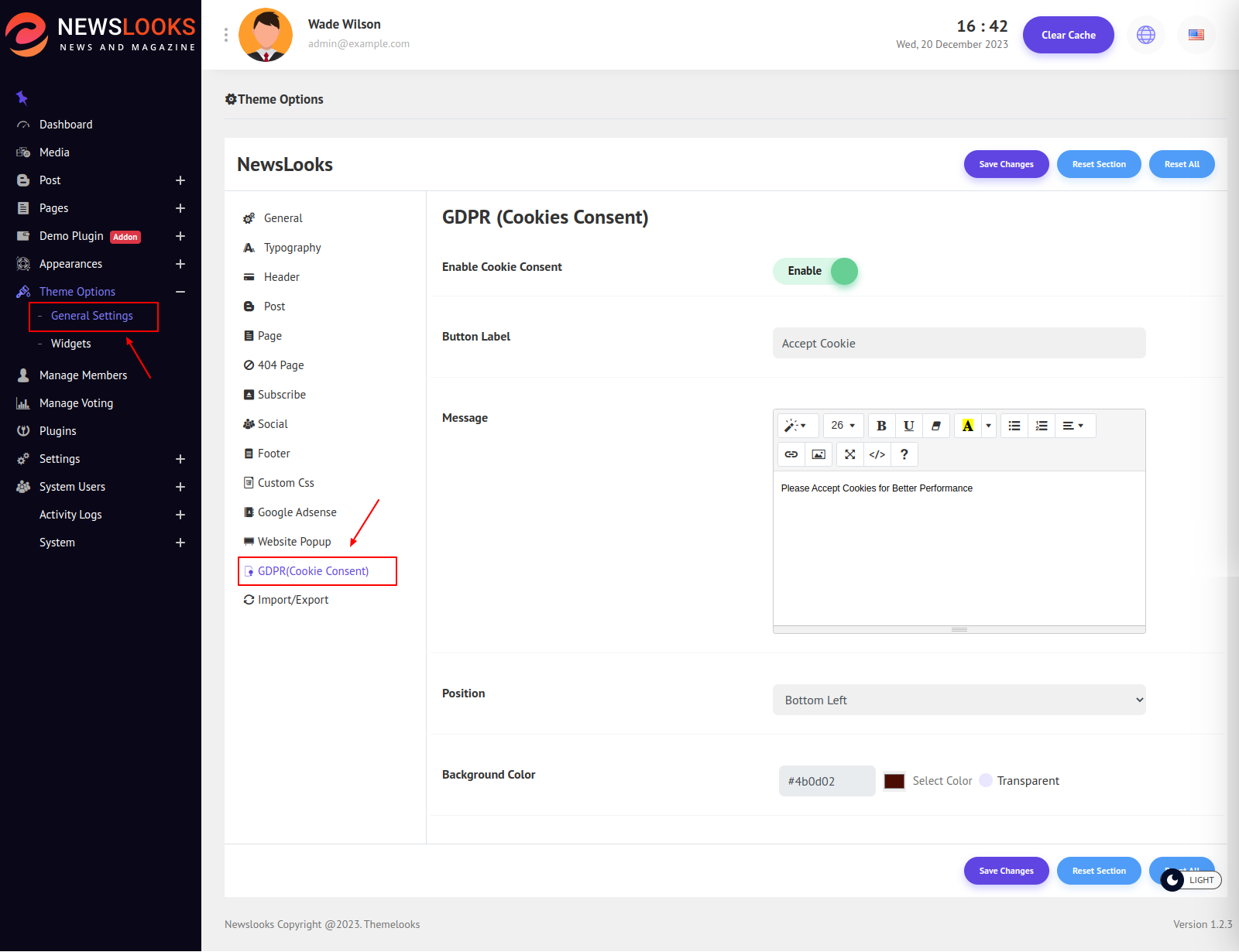 You can customize the GDRP (Cookie Consent) as you like. Follow Theme Options > General Settings. Here click the GDRP (Cookie Consent) tab and its related fields will appear.