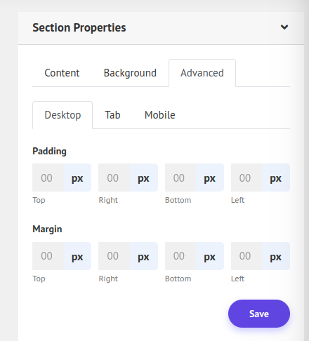 In the Background and Advance Tab, you can customize the section background, and Padding, Margin. You can also give different Margins and Padding for different devices.