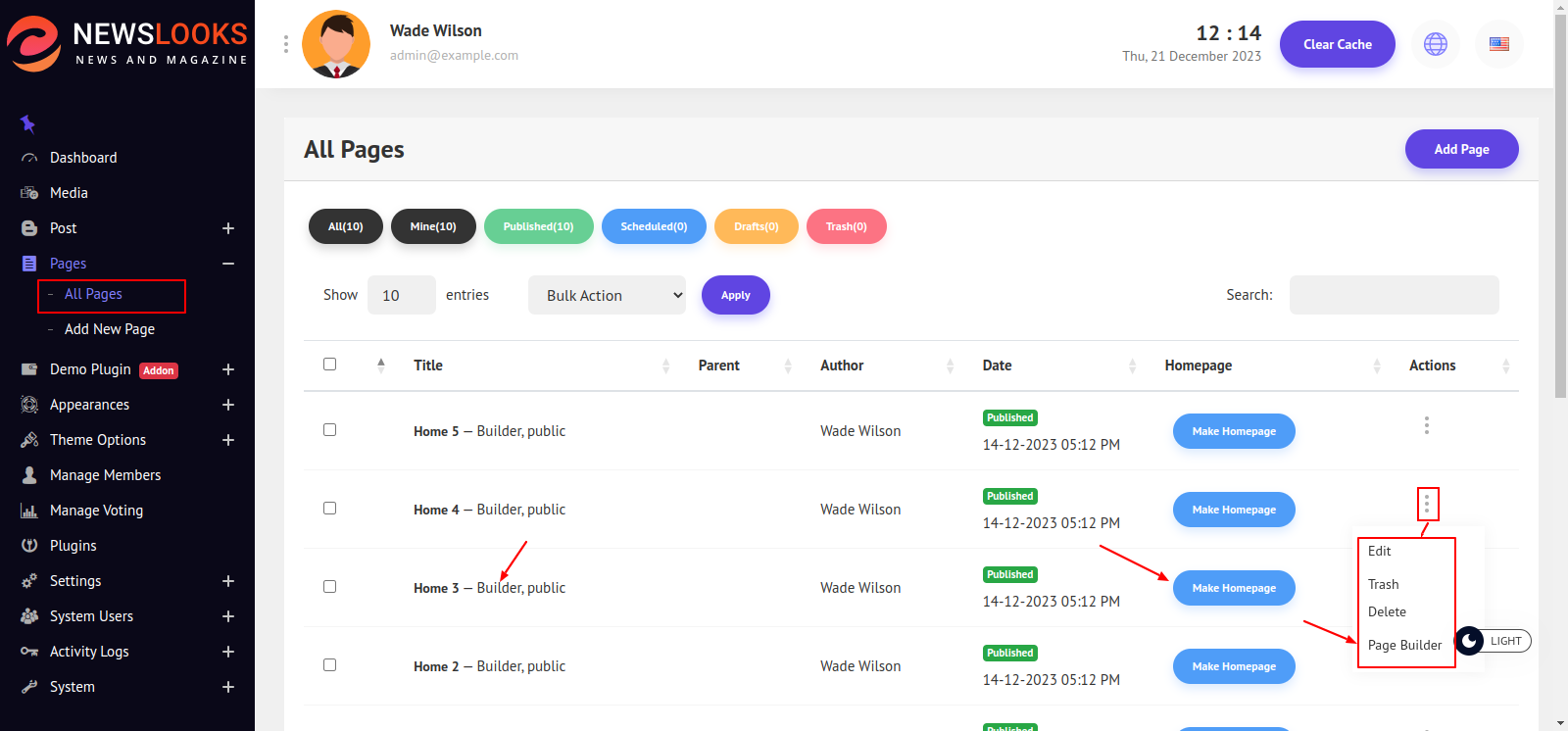 In the page list, you can see an option appeared, Make Homepage. You can now make any page Home Page, If it's made with Builder then the content will come from Builder, or if not then the page content will be the home page content.