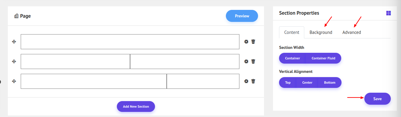 On the right, you can see the section settings properties. In the Content Tab, you can select if the section should be in a container or container fluid. Then The Section content Vertical Alignment.
