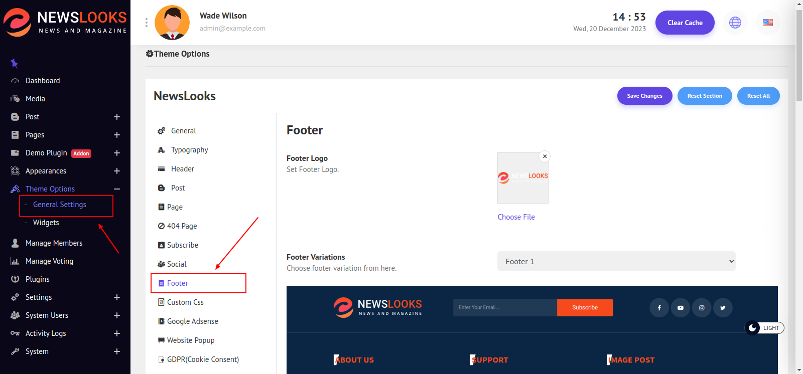 You can customize the Footer Section as you like. We Have 2 Different Types of Footer Variations. Follow Theme Options > General Settings. Here click Footer, and the footer fields will appear.