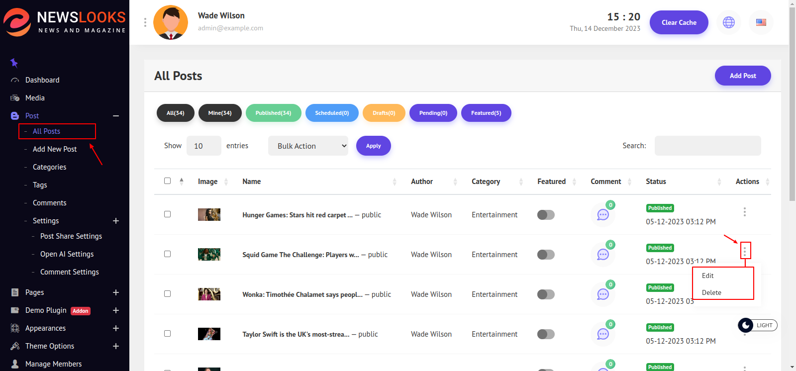 Follow Posts > All Posts to see the post list page. Here you can filter posts, manage status, edit posts, delete posts, and also can create posts.
