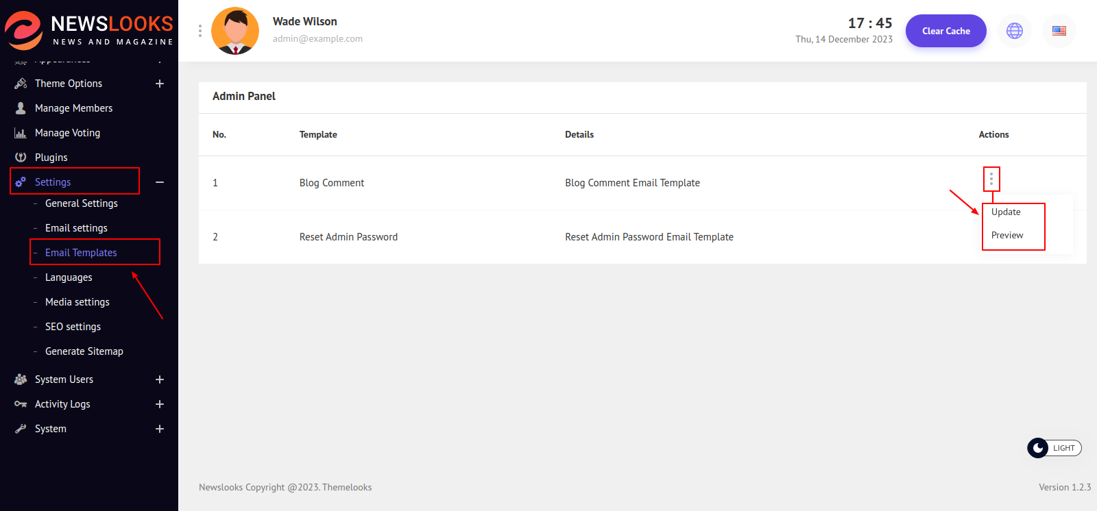 Now to update an email template click the three dots(.)and then click Update. A Modal will appear.
