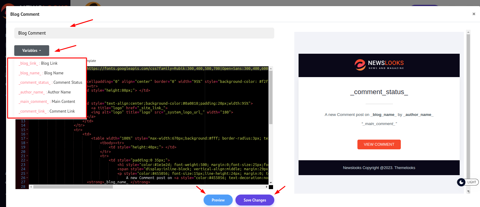 As you can see in the below image, the modal is divided into two sections. The left side is a Code Editor, where the template code is written. And the right side is a Preview box where you can see the preview for that code. Make changes to the code and click Preview to view the update.