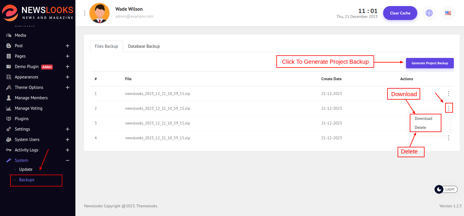 From Here you can create a Project Backup by clicking the Generate Project Backup button. It will take some time and generate the backup file. Now you can download the file and also delete it.