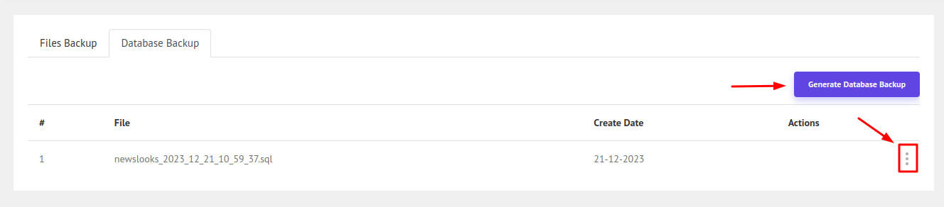 Now to generate Database Backup click the Database Backup tab. Similar to project backup you can also generate database backup and download it.