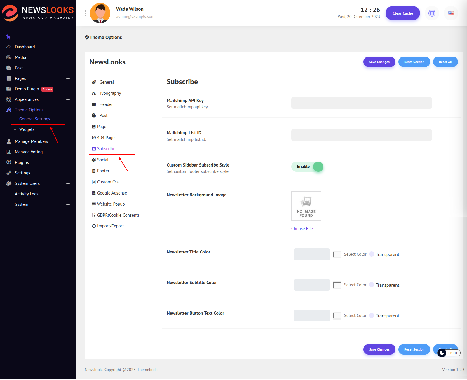 Click Save Changes to save theme options. Click Reset Section to reset only this section. Click Reset All to reset all theme options.