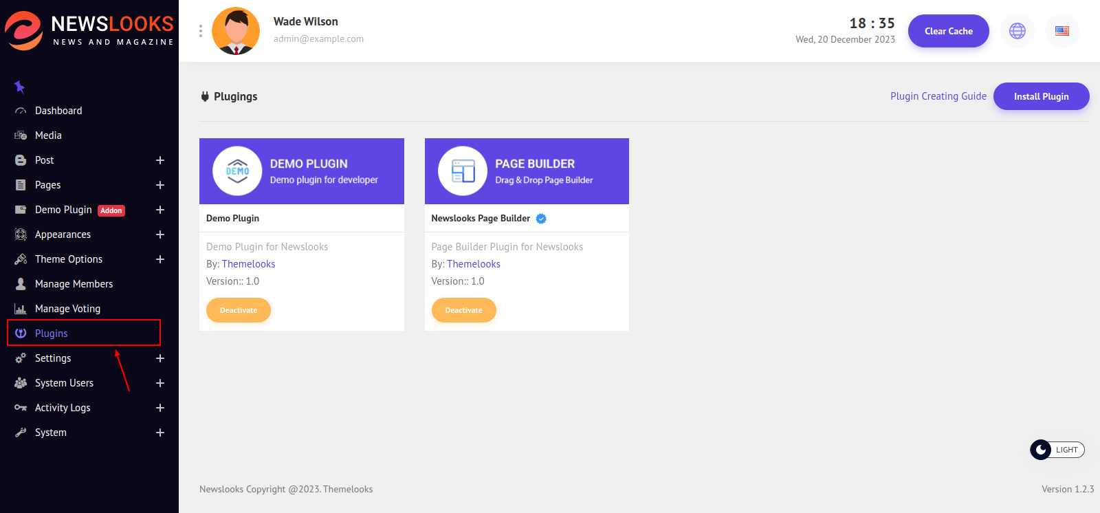 Newslooks gives a plugin system to extend the CMS functionality. You can easily manage these plugins from the plugin module. In this post, you will learn how to activate and deactivate Plugins. Follow Plugins from the sidebar.