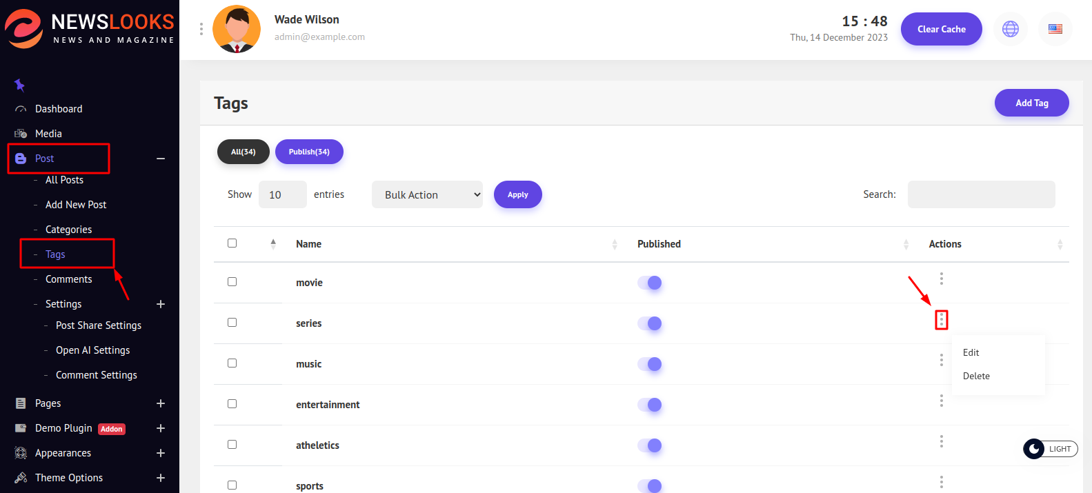In this post, we will learn how to manage Post Tags. Follow Posts > Tags and you will be redirected to the tag list page. Here you can find all the available tags, search and find, filter, manage, delete, and create new ones.
