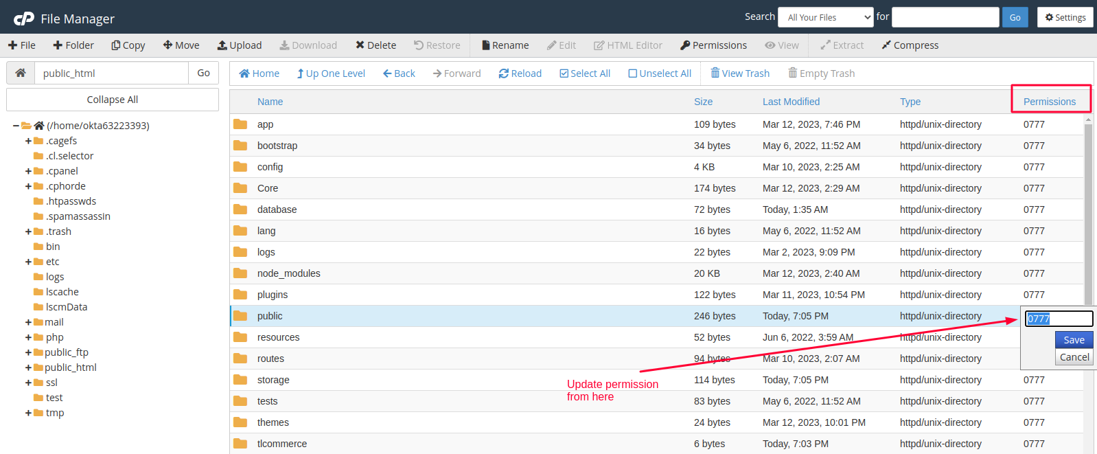 The following image has an example of how you can change folder permission in cpanel.