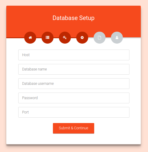 Now on the Database Setup page, you need to set DB Host, DB Name, DB Username, DB Password, and DB Port. Now click Submit & Continue.